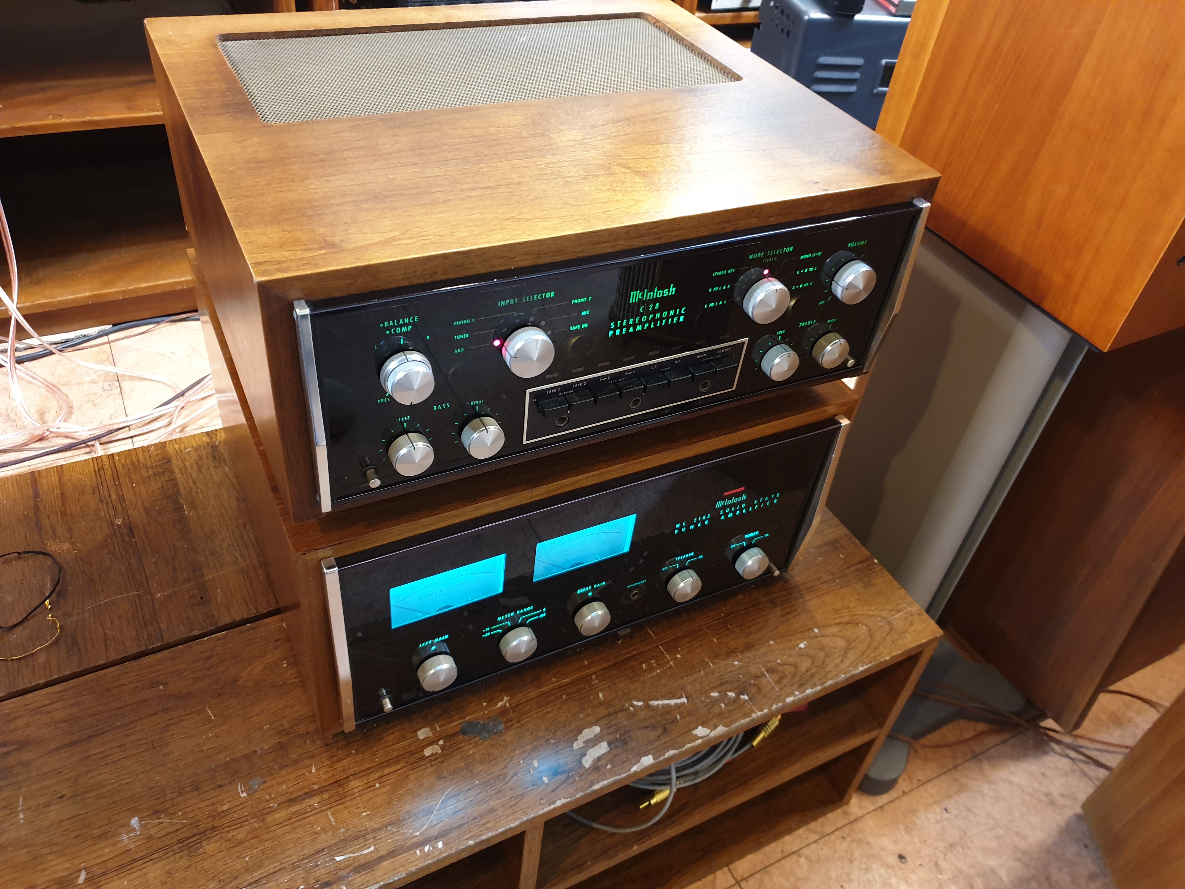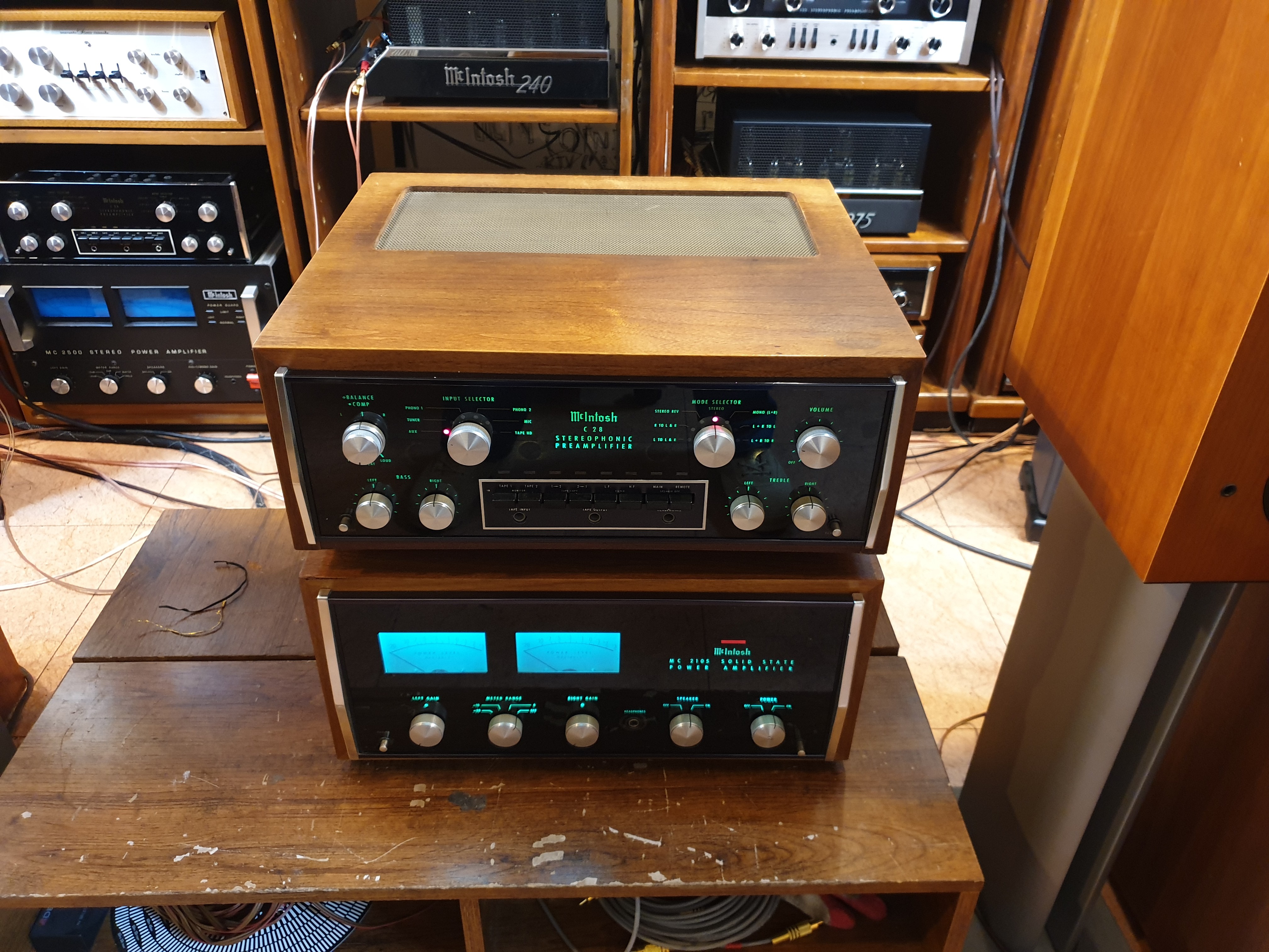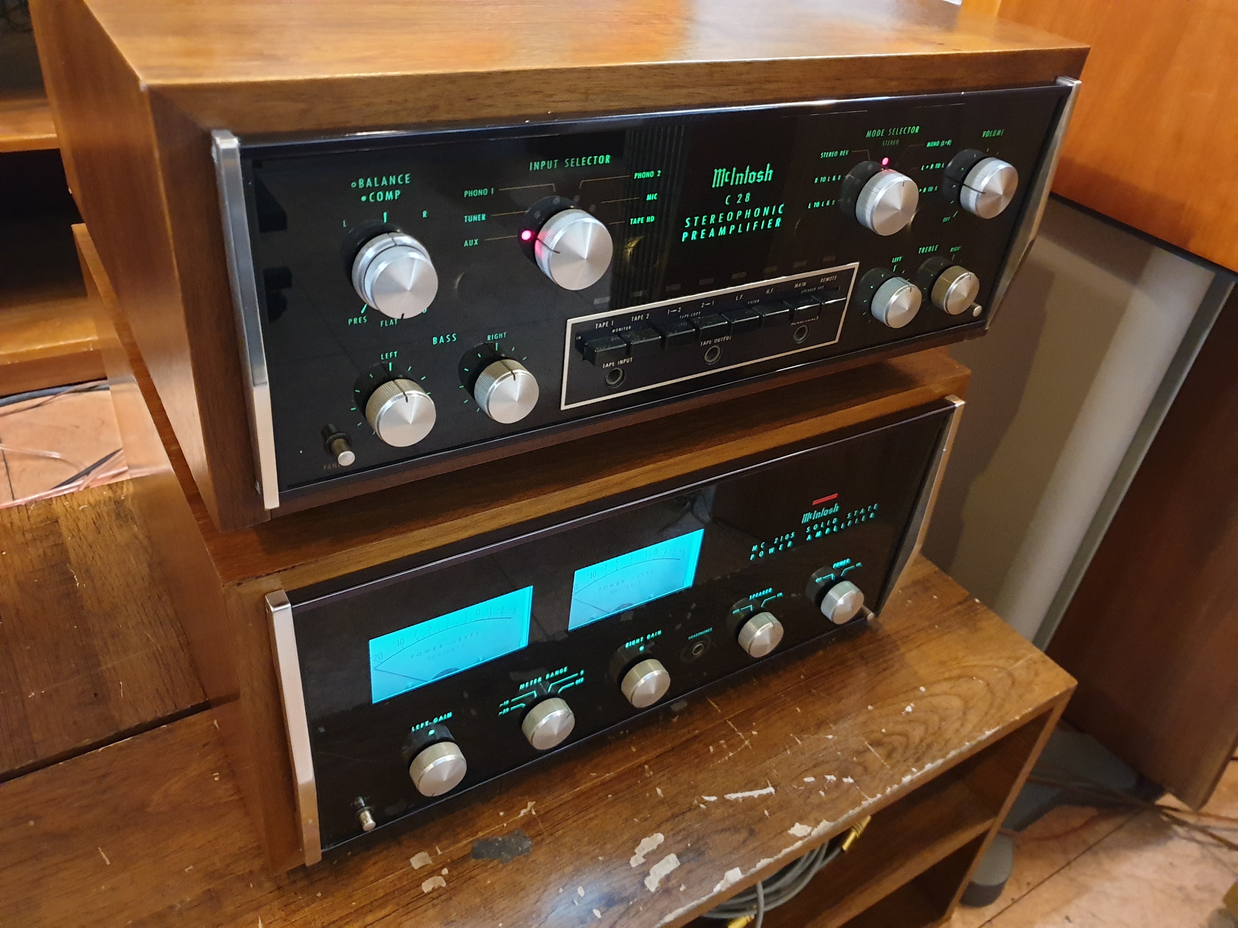 미국 맥킨토시 사의 보기드믄 구형 분리형 제품인 명기조합 C28프리엠프와 MC2105 파워엠프 구성입니다.