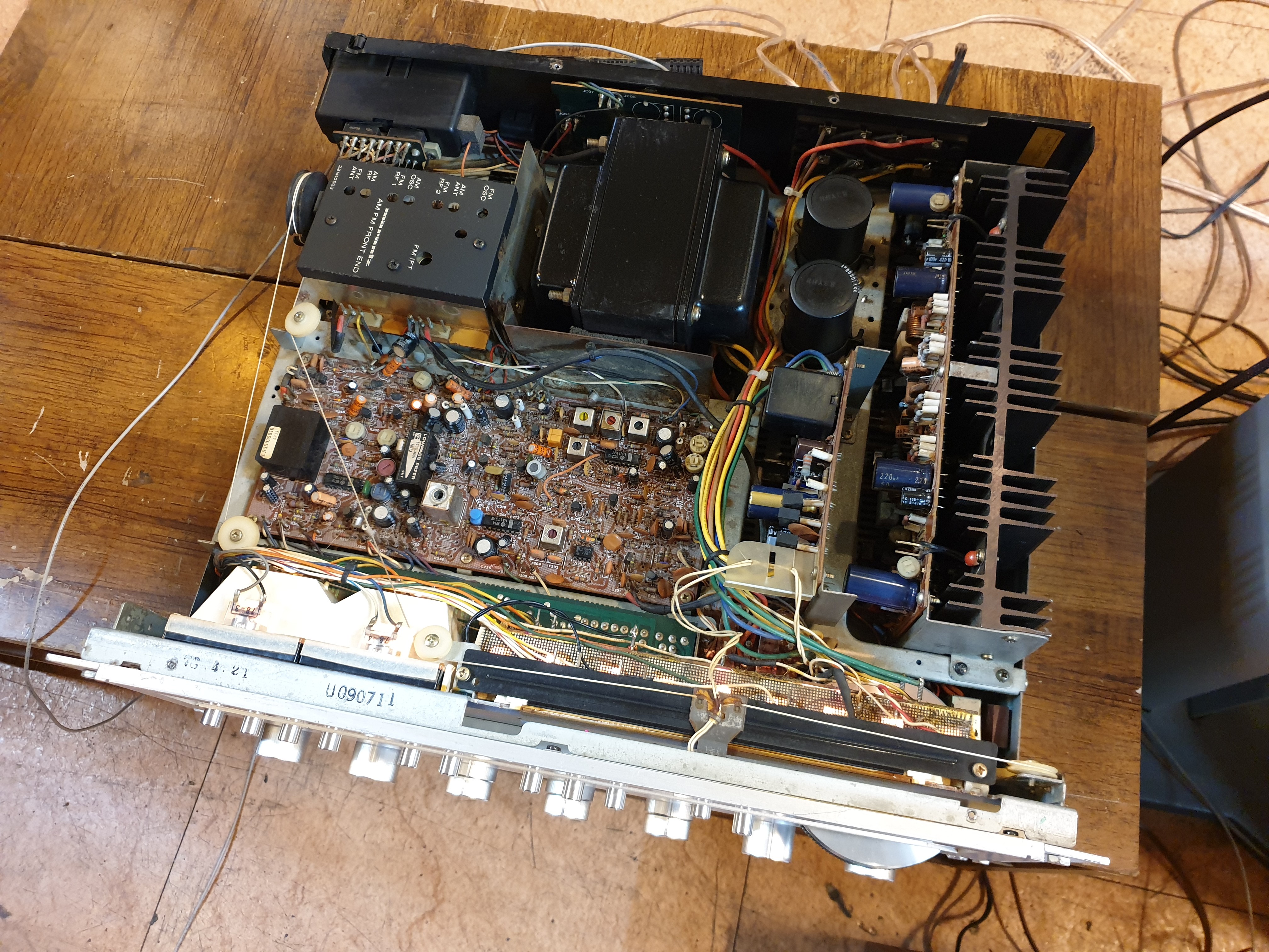 내부상태는 사진과같이 세월의 흔적이 있으며 새끼손가락 마디만한 콘덴서들은 일본 제품들로 오버홀이 되어있는