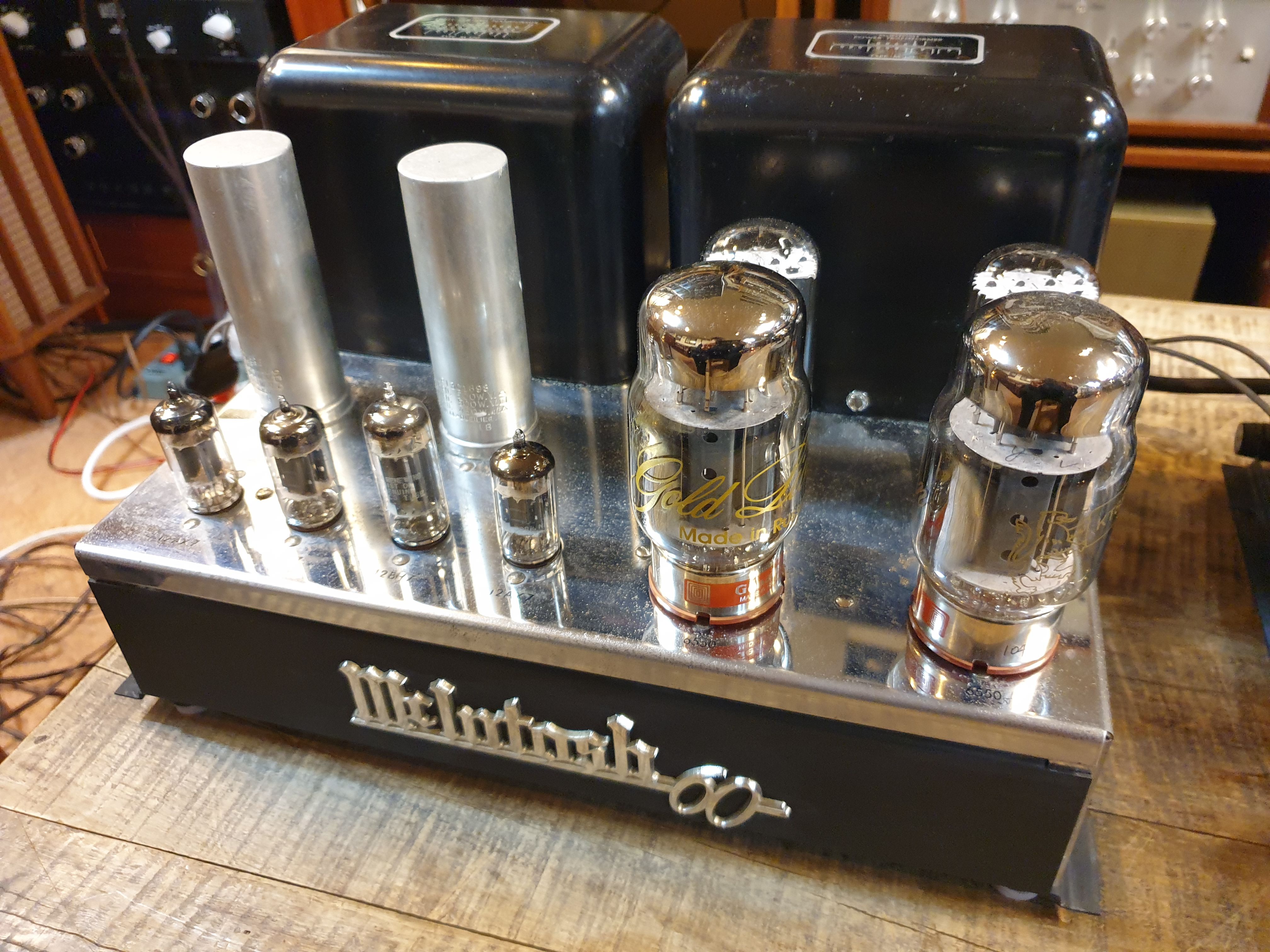 MECHANICAL: Chrome chassis. Octal socket powers McIntosh C-8, C-4, C104, or C-108 preamps. Output octal socket for all impedances. Barrier strip for 4, 8 and 16 ohms as well as 0.5V input. Line voltage tap for 117 or 125V. Audio input. Gain control.