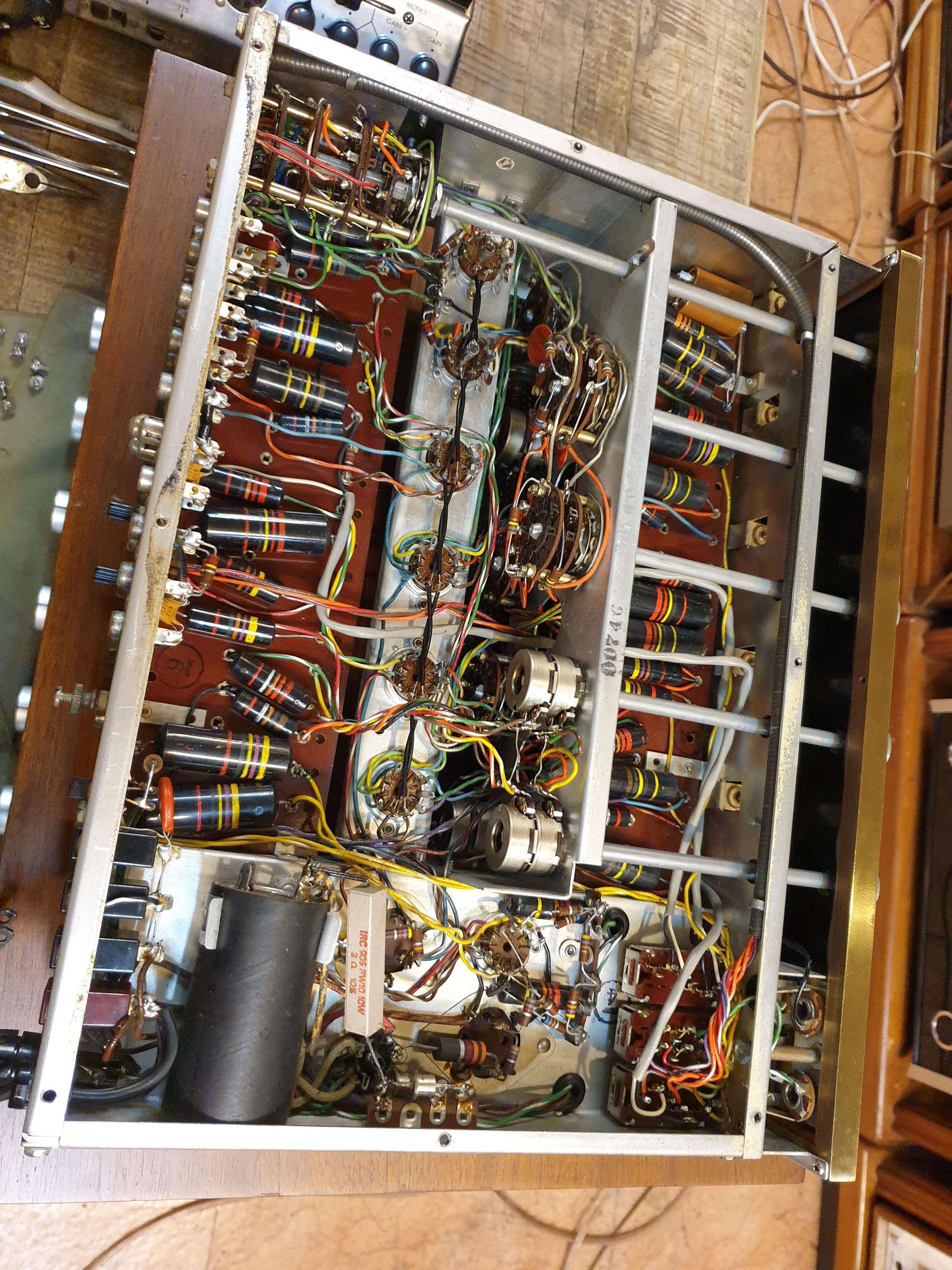 FRONT PANEL: Glass panel with anodized aluminum trim. Early versions had plastic panel with brass trim. Mode selector: rev, stereo, L, R, M left, M right. Balance. Phase: 0 or 180. HF cutoff filter: flat, 9kc or 5kc. Loudness: flat to max. Volume with power switch. Input selector: aux, tape, tuner 1, tuner 2, phono 1 (stereo or mono), phono 2 (stereo or mono), tape hd 1 tape hd 2. Record compensator: bass switch: 0, 300, 400, RIAA, LP, tape. Treble switch: tape, -5, -10, -12, RIAA, LP. Bass and treble controls. Rumble filter. Tape compare switch. Tape jacks and switch. Headphone.