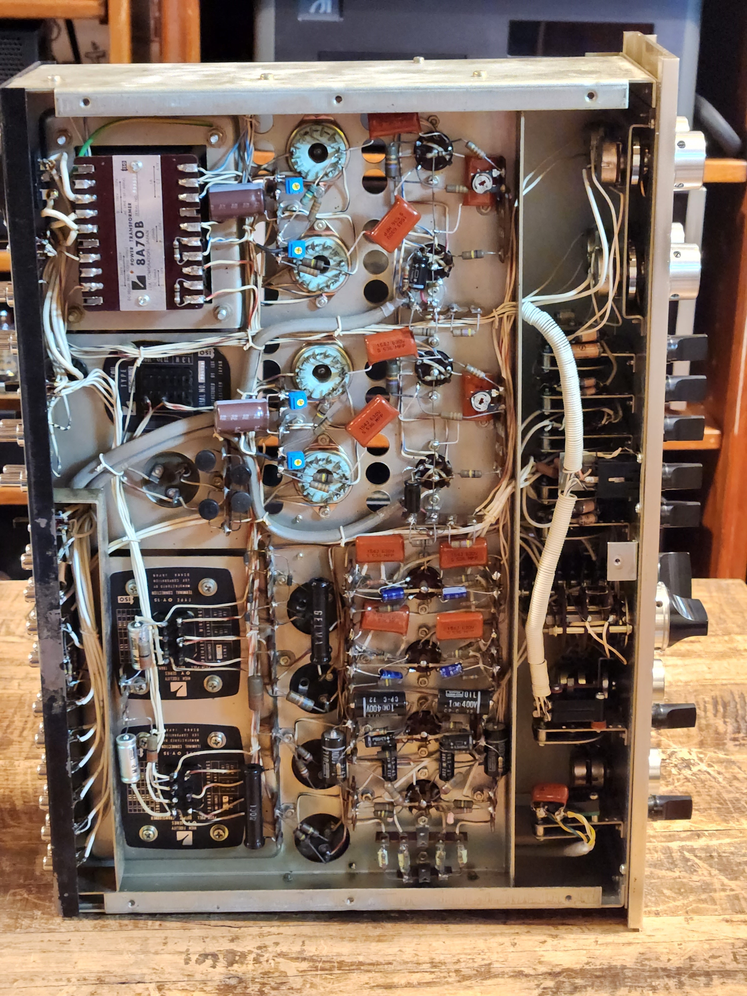 희귀한 출력관을 사용한 제품입니다. 초단관 역시 많이 사용된 모델로서 트렌스를 보시다 싶이 만듬세가 진공관