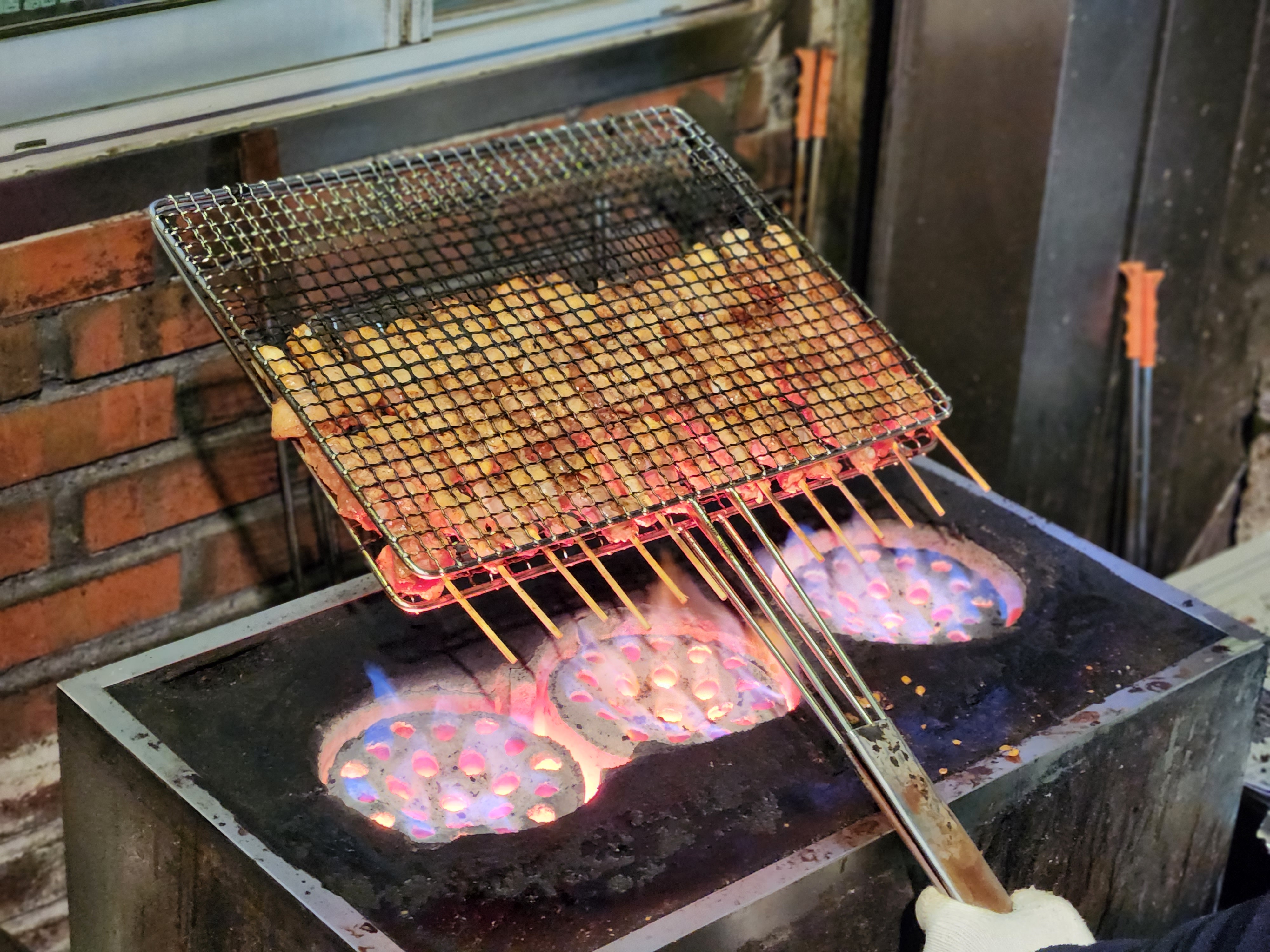 연탄불에 저렇게 닭꼬치를 굽고있어요~