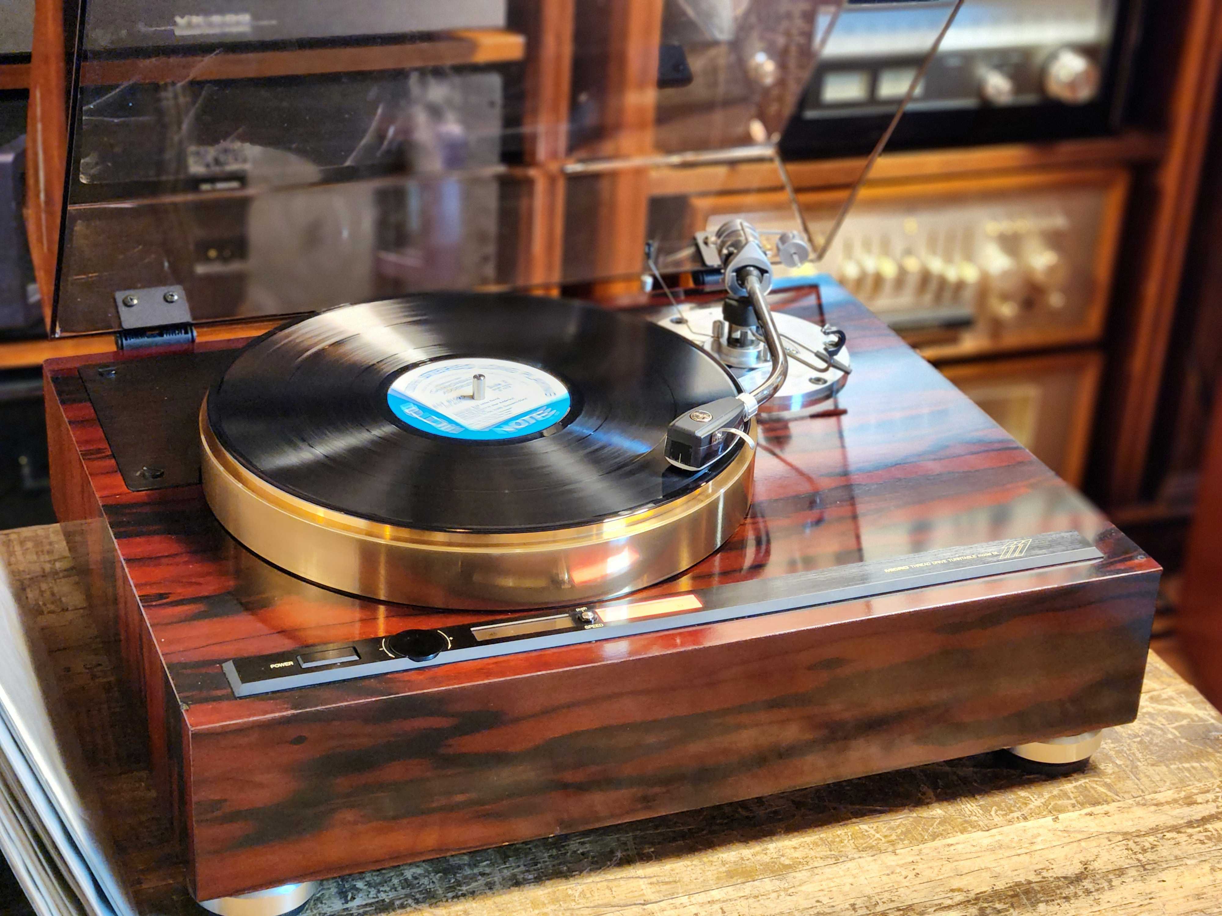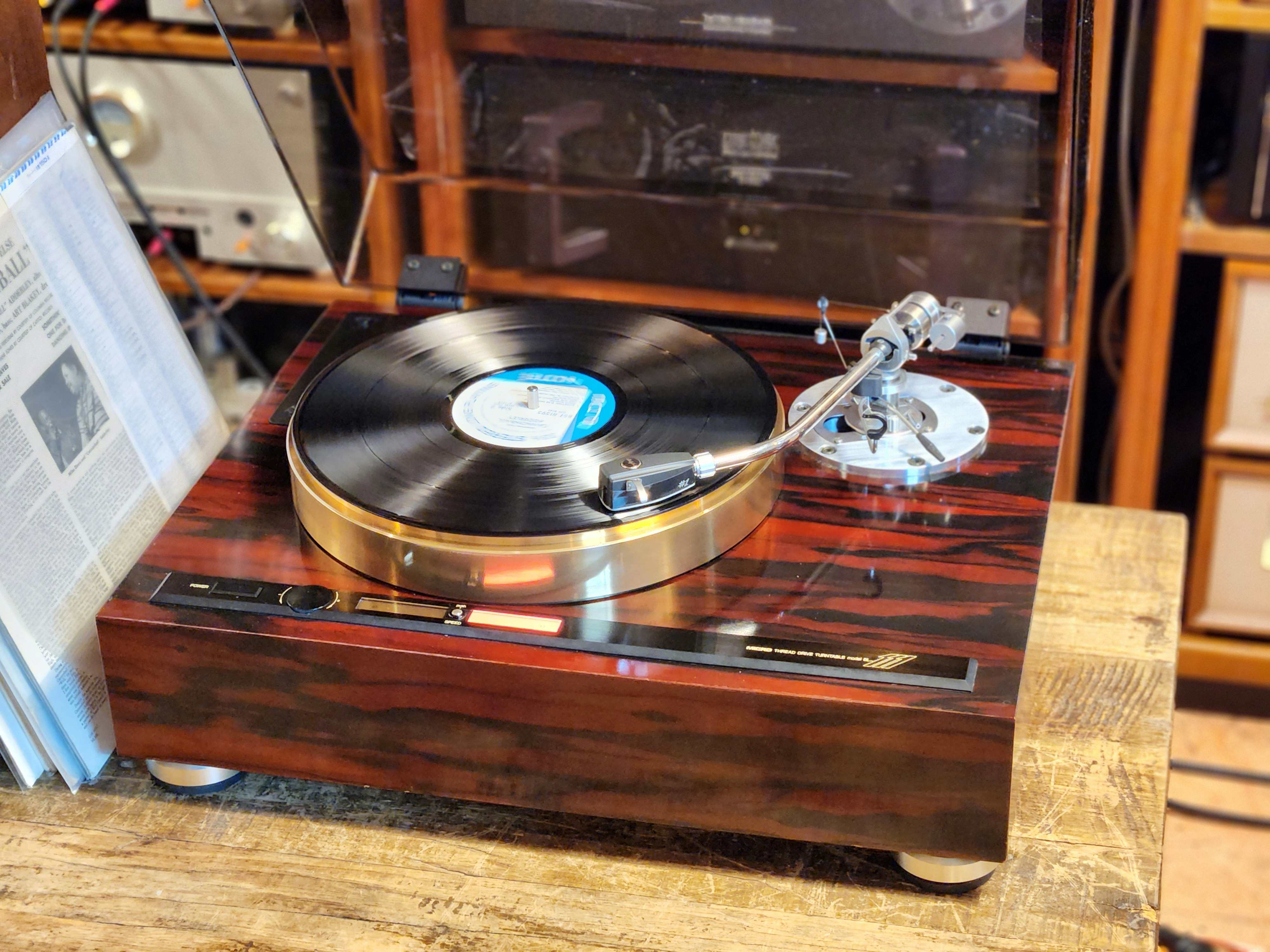 Micro Seiki BL-111은 범용 톤암 마운팅 베이스가 있는 스레드 드라이브 턴테이블입니다.