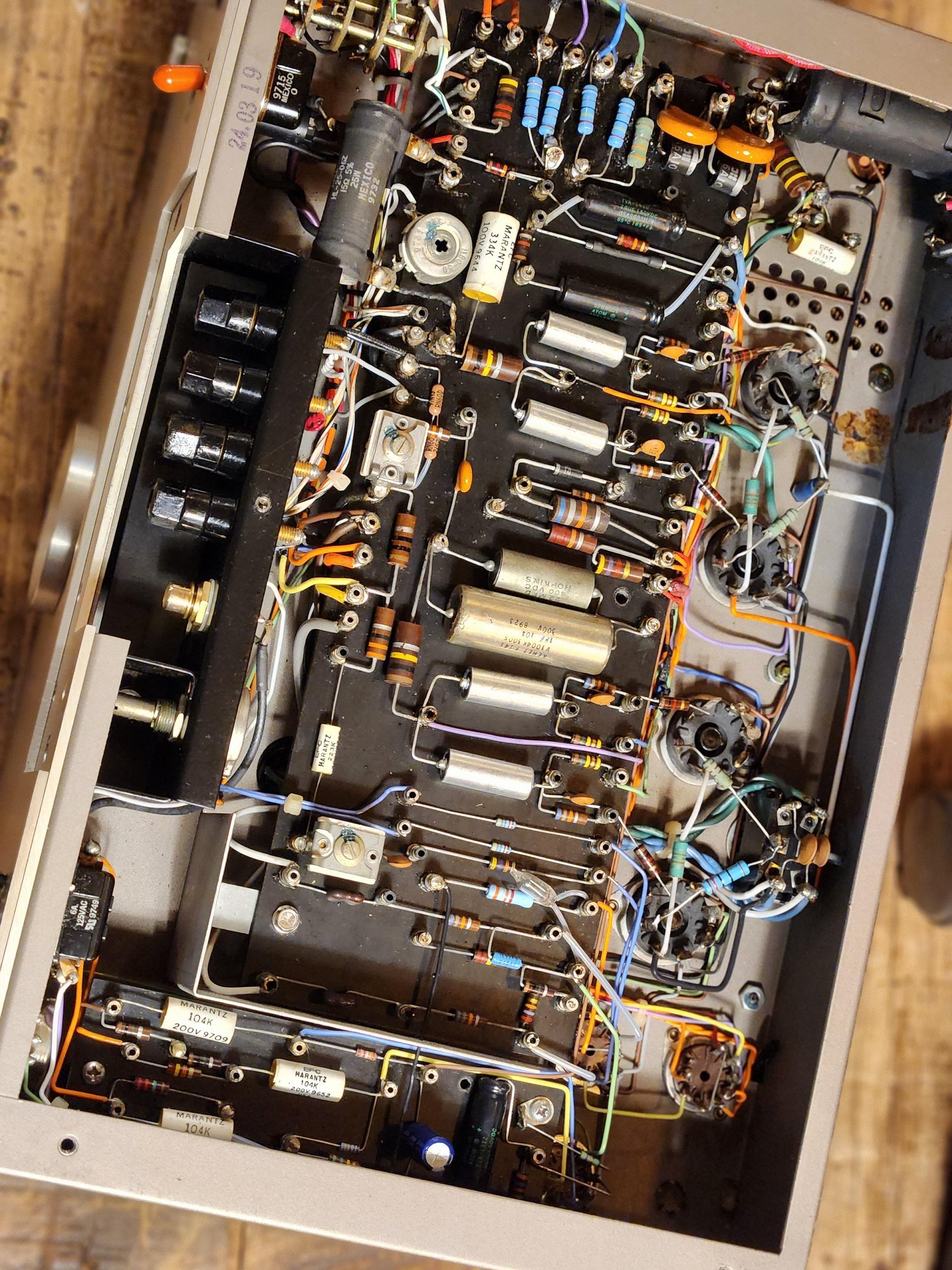 EL34 진공관을 사용한 이 초선형 병렬 푸시-풀 설계는 70와트의 전력을 생산했는데, 이는 당시로서는 상당한 성과였습니다. 증가된 출력은 부분적으로 McIntosh와의 강력한 경쟁에서 비롯되었습니다. McIntosh의 파워 앰프(당시)는 일반적으로 동급 Marantz 모델보다 더 근육질이었습니다. Model 9를 3극관 작동으로 설정하여 더 낮은 와트수에서 더 나은 사운드를 얻을 수도 있다는 점은 주목할 가치가 있습니다.