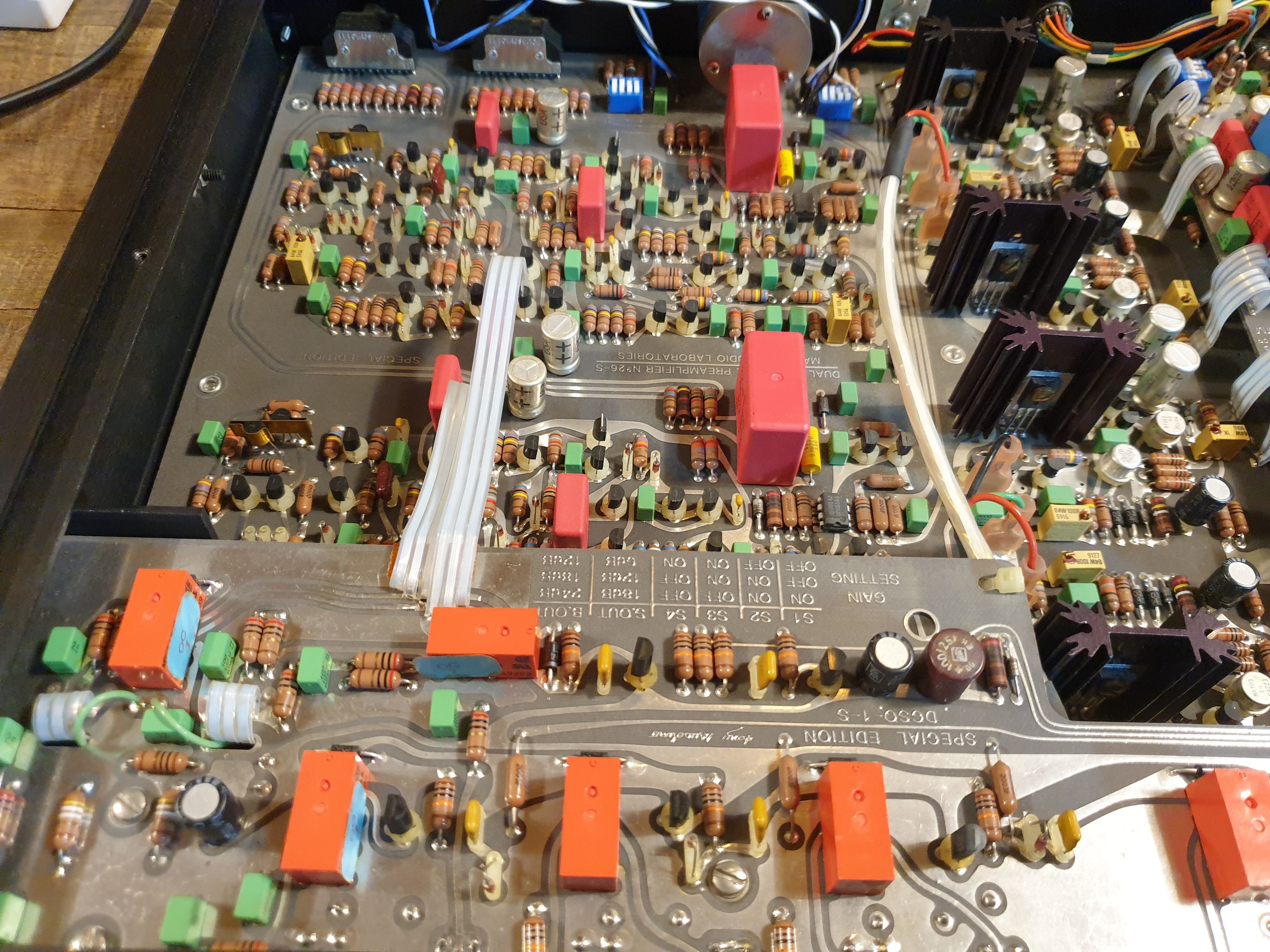이러한 카드에는 각각 게인 변환 스윗치가 설치되고 있어 포노카드에는 impedance 변환 스윗치도 탑재하고 있습니다.이 게인 변환 스윗치와 프런트 패널상의 좌우 독립 게인 컨트롤의 편성에 의해서, 모든 입력에 대응하고 있습니다.