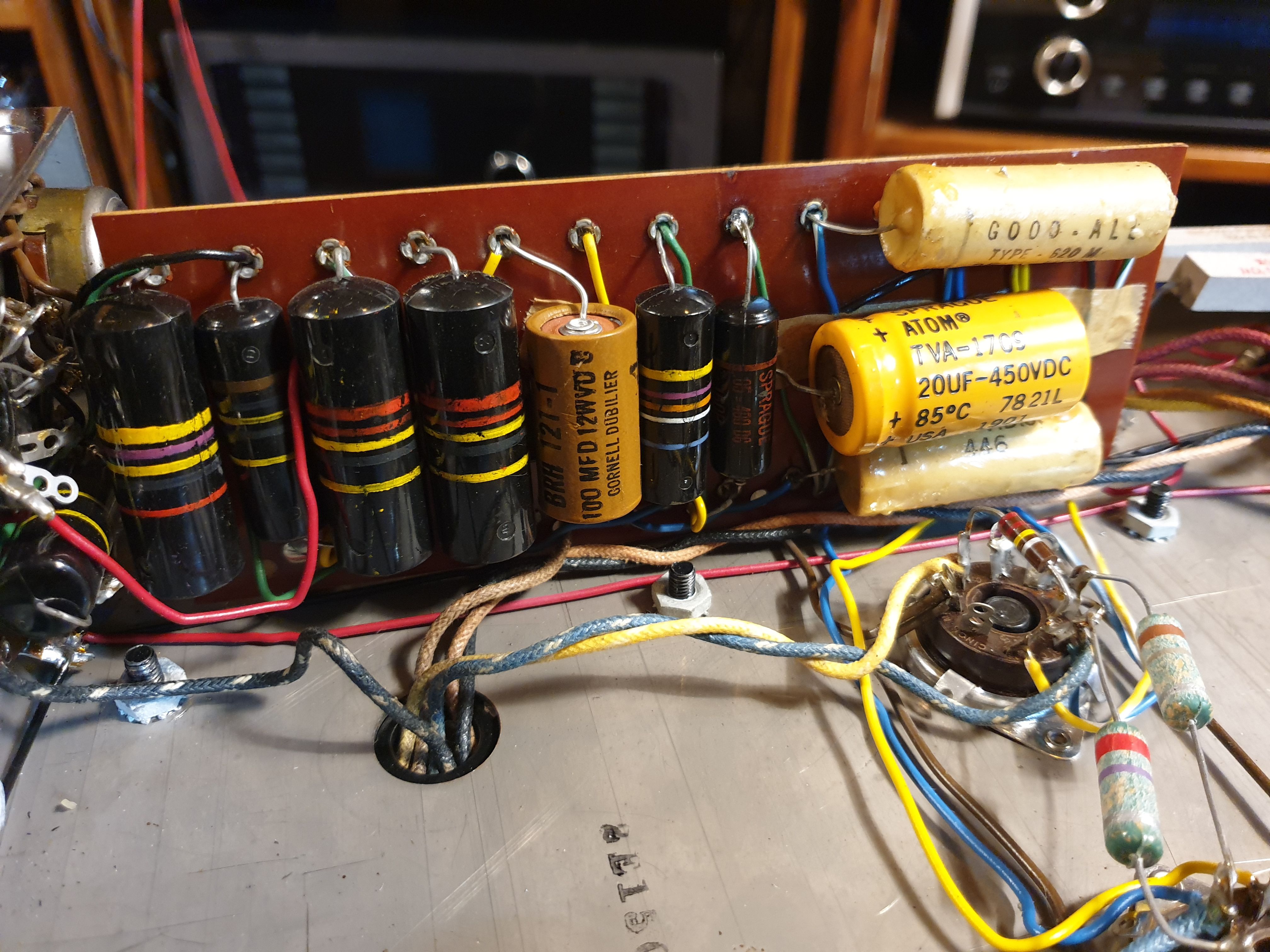 밸브 보완: 2 x 6L6GC, 2 x 12AX7 1 x 12AU7, 1 x 12BH7, 1 x 5U4GA