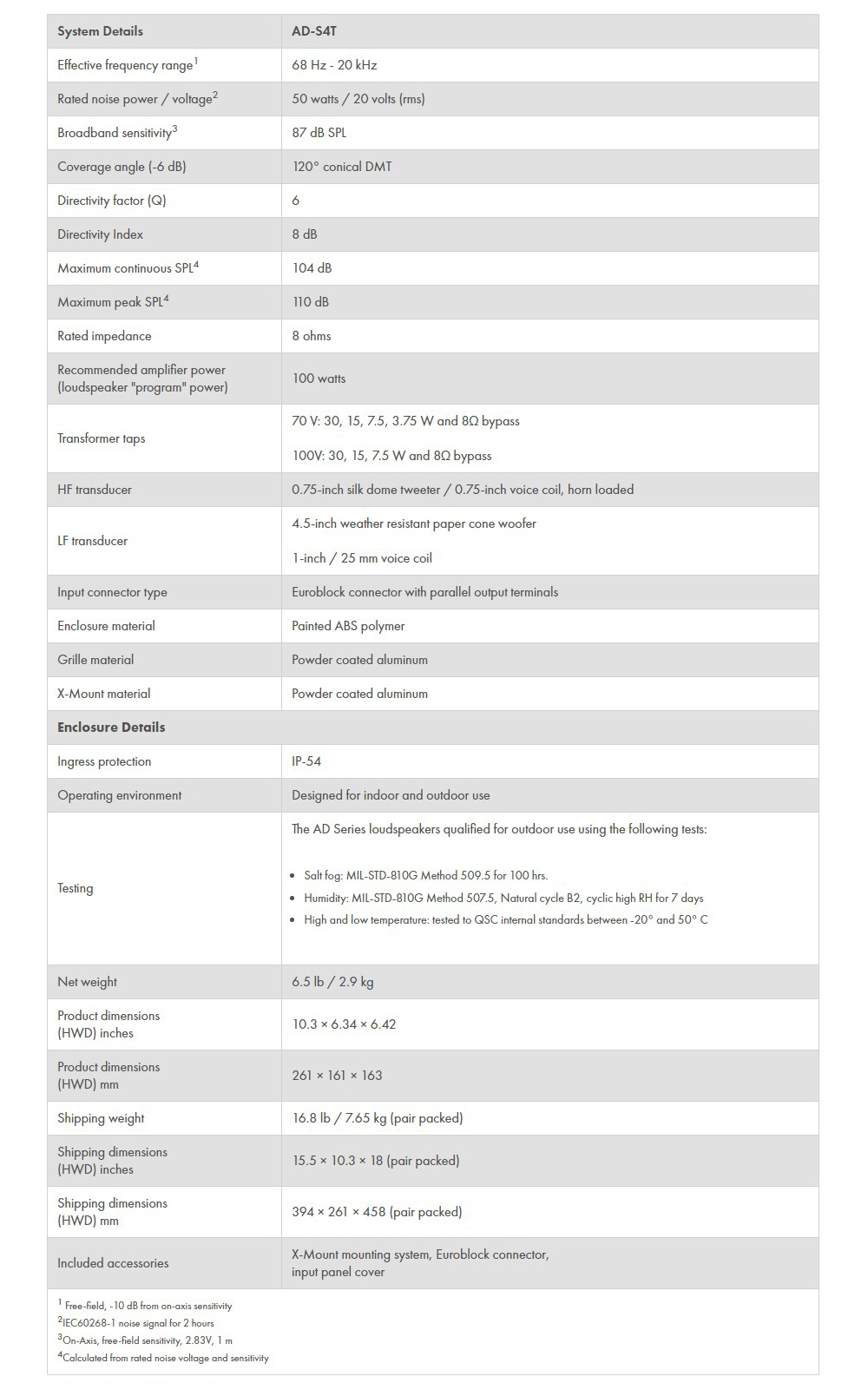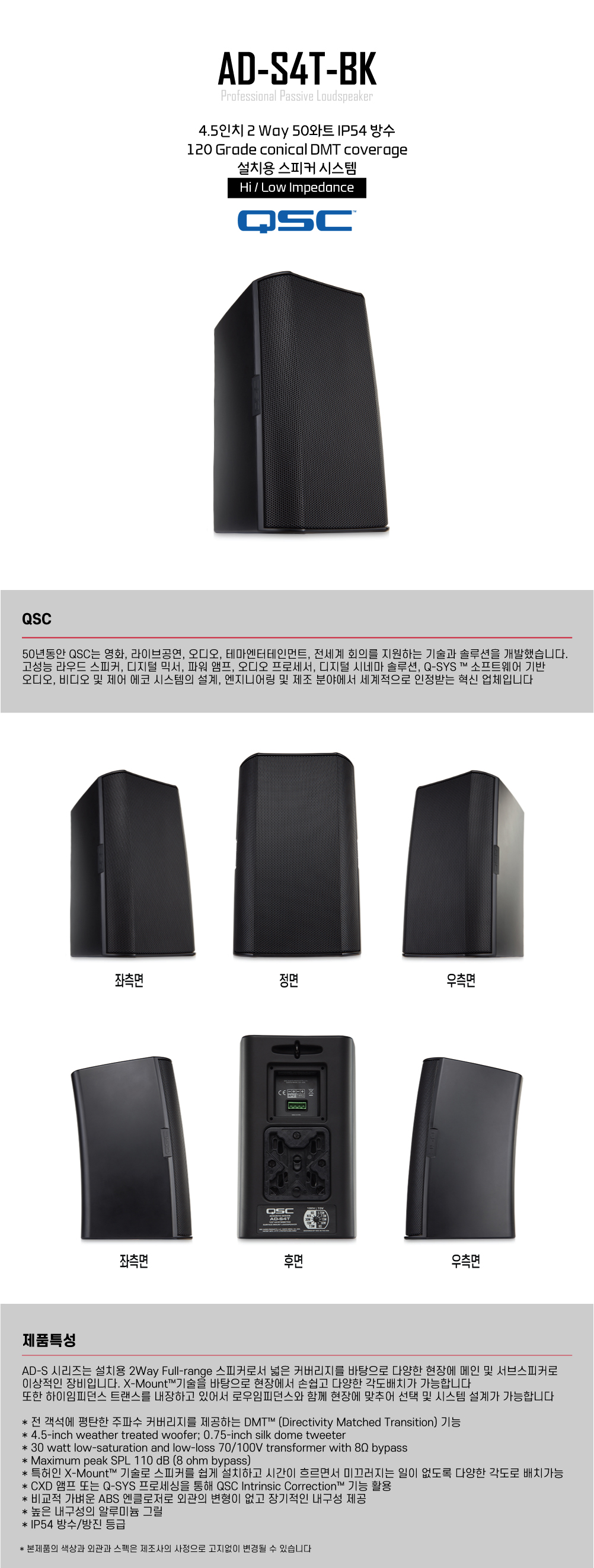 QSC사의 AD-S4T 옥외용 방수방진 가능한 벽걸이 스피커 입니다. 4.5인치 2way 스피커로서 벽부형이 가능한