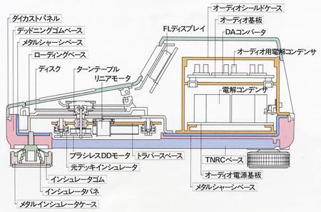 음압에 의한 진동에 대해서는, 금속 메탈 섀시, 특수 제진 시트, TNRC의 이종 소재에 의한 다층 구조 중량 베이스를 채용하고 있습니다. 그리고 캐비닛은 견고한 아연 다이캐스트 일체 성형 구조로 하고, 또한 바닥으로부터의 진동에는 4개의 대형 인슐레이터와 광학 데크의 더블 인슐레이터 구성으로 대응하고 있습니다.