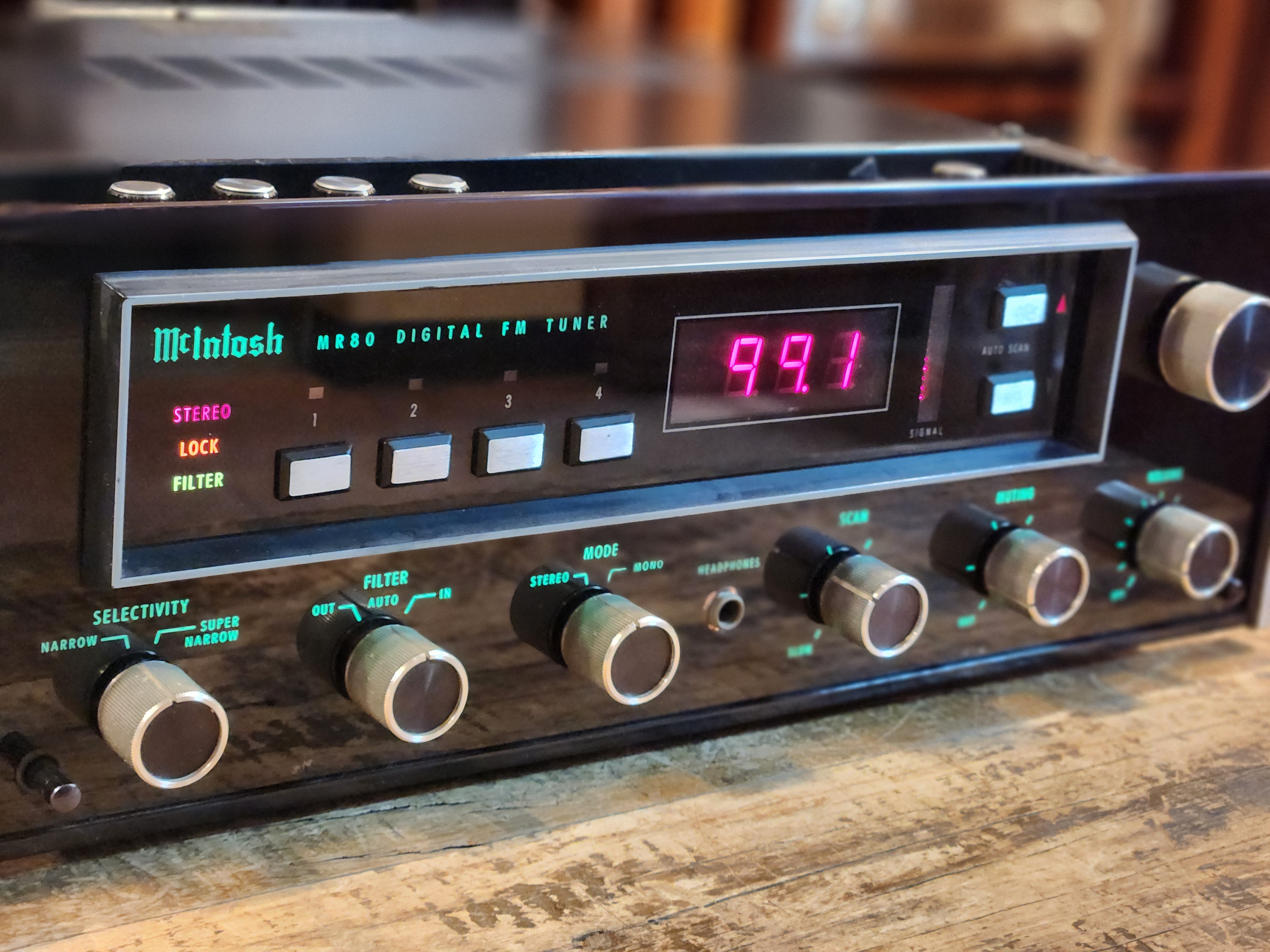 미국 맥킨토시 사의 MR80 튜너 입니다. 아날로그와 디지털 기능이 섞여있는 로직방식의 튜너입니다.