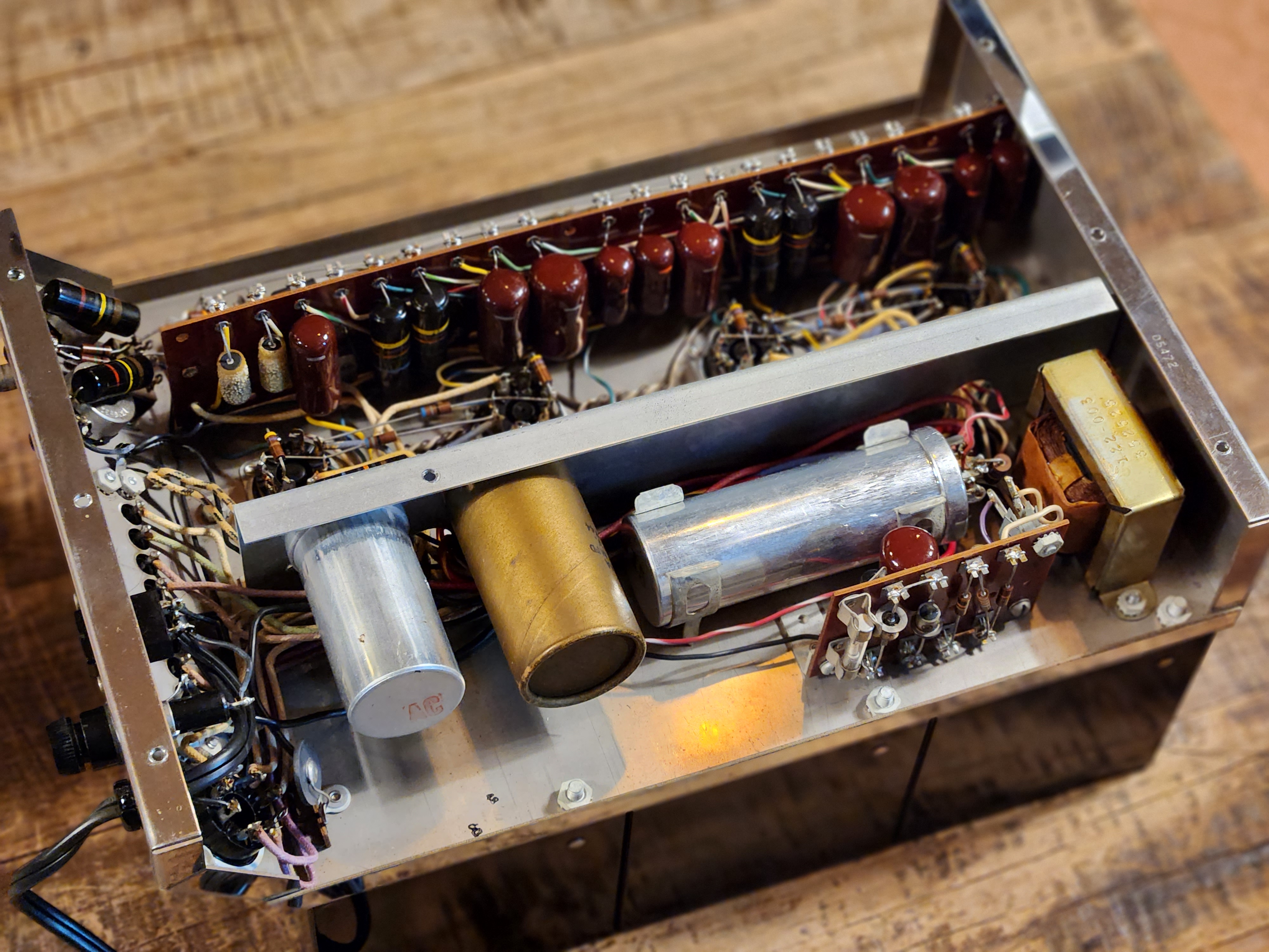 MECHANICAL: Chrome chassis. Output octal socket for higher impedances and voltages. Barrier strip for 4, 8 and 16 ohms. Audio inputs. Gain controls. Stereo-mono switch. Can be used for 50w mono.