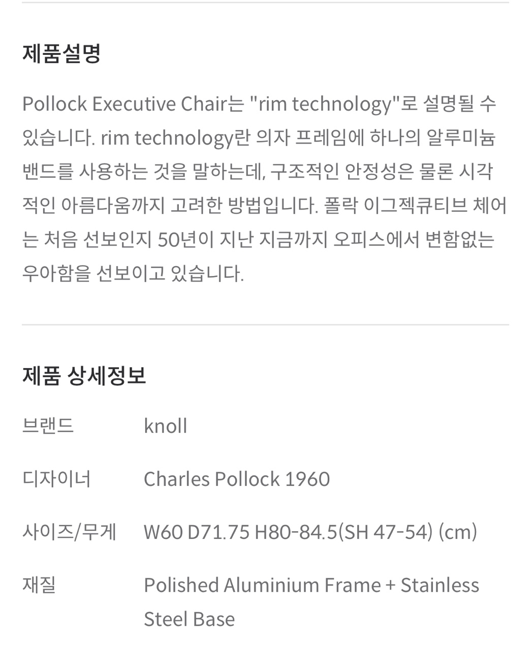 이 제품은 요즘도 리프로덕션을 하고있는 "Knol 놀 사의 폴락 이규제크티뷰 체어" 에요 오피스체어 답게
