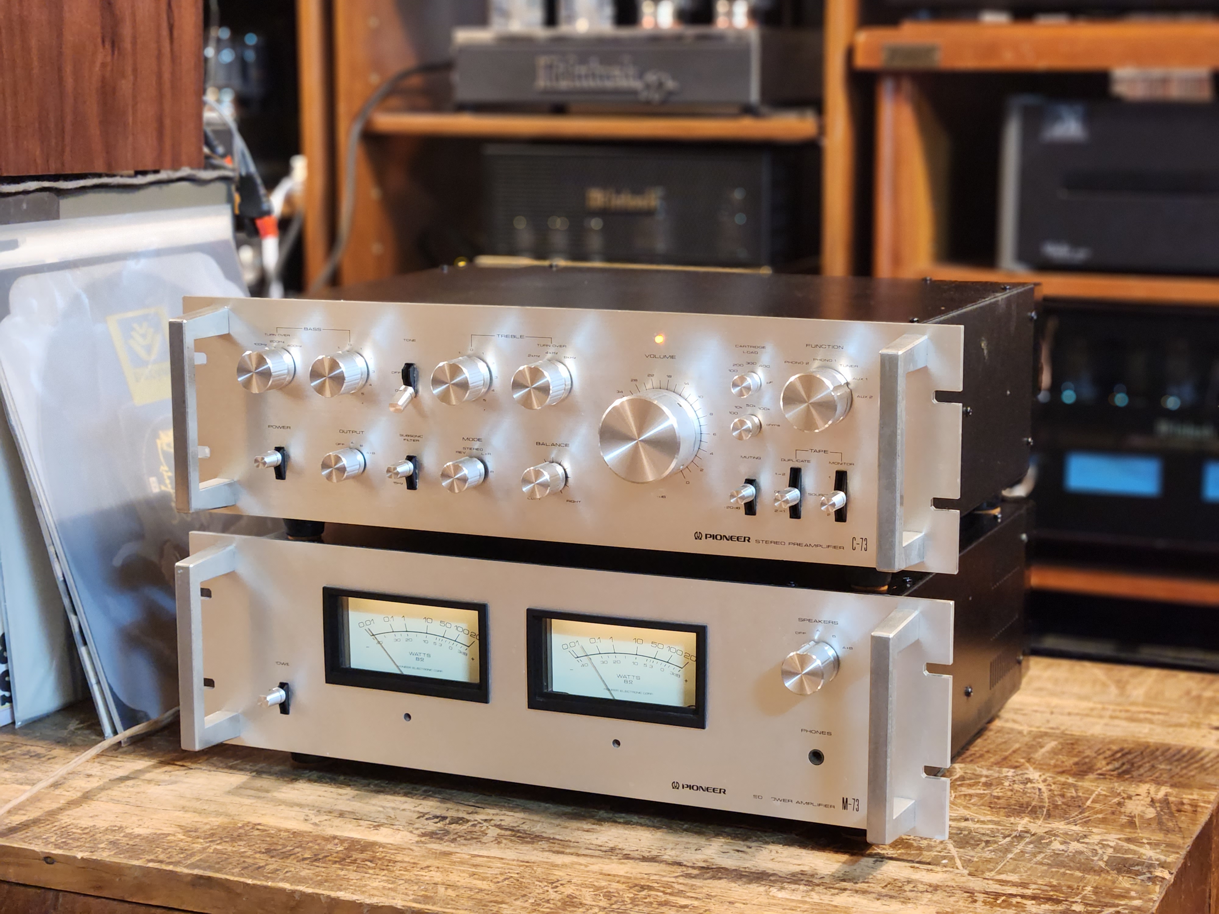 요즘은 보기드믄 제품입니다. 내/외관 상태 양호한 일본 파이오니아 사의 C-73 프리엠프와 M-73 파워엠프 입니다.