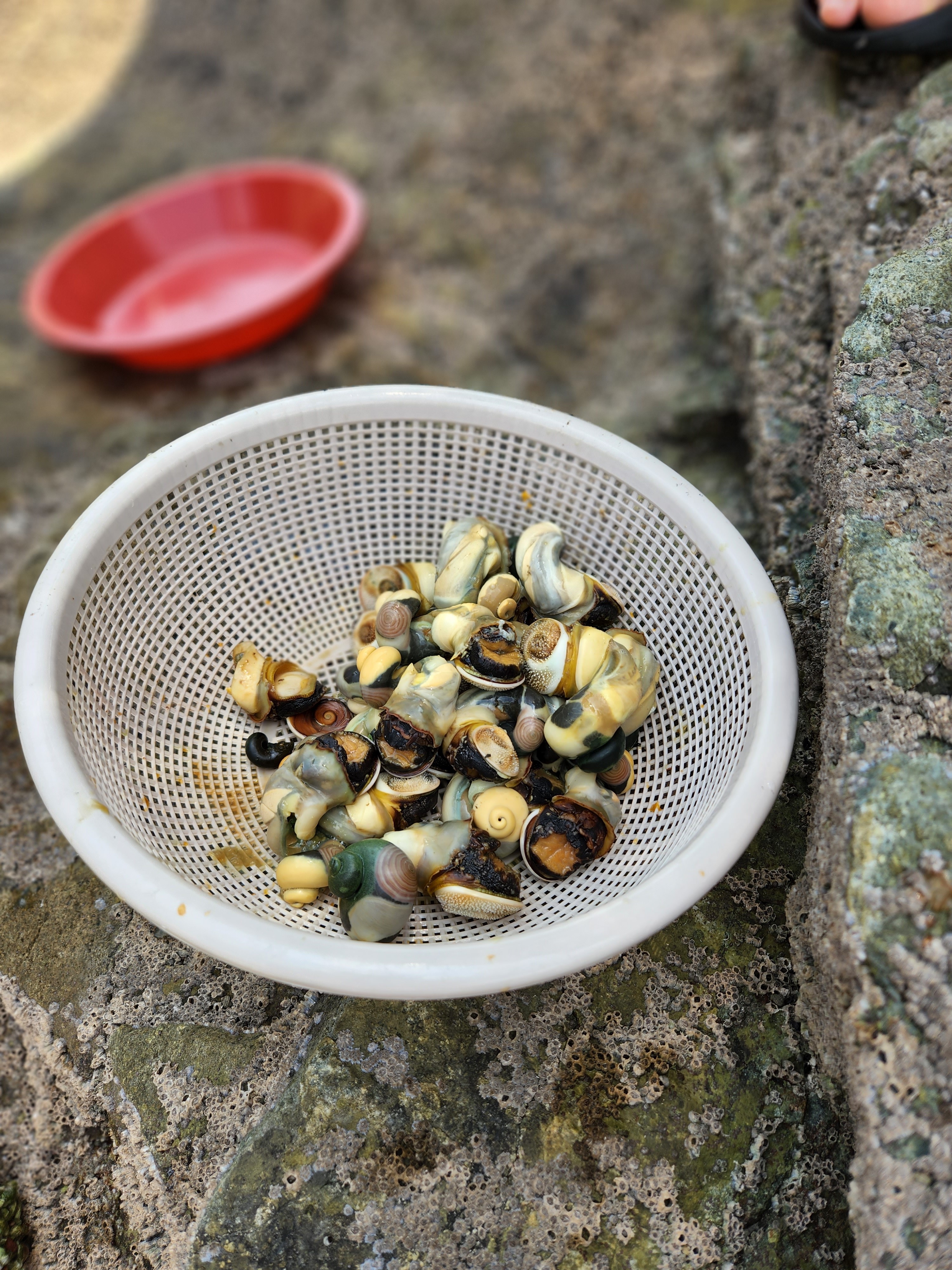 바다에 발도담그고. 놀다보니 3번째 입수하시고 돌아오신 손님이 소라를 또 엄청 담아오셨습니다