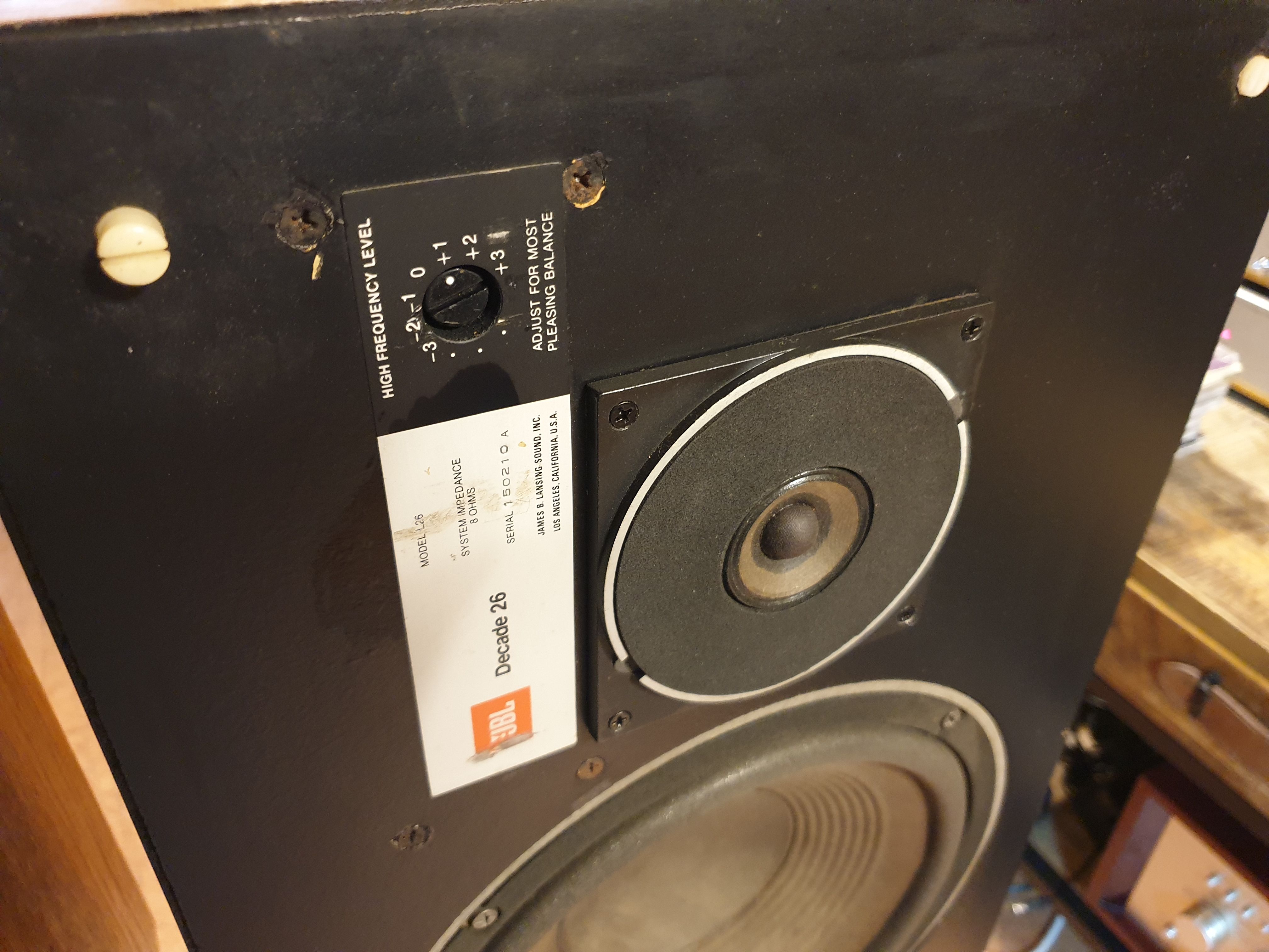JBL 사의 L시리즈 막내격인 L-26 Decade 데케이드 스피커 입니다. 이제품은 알니코 자석을 사용한 10인치 우퍼를