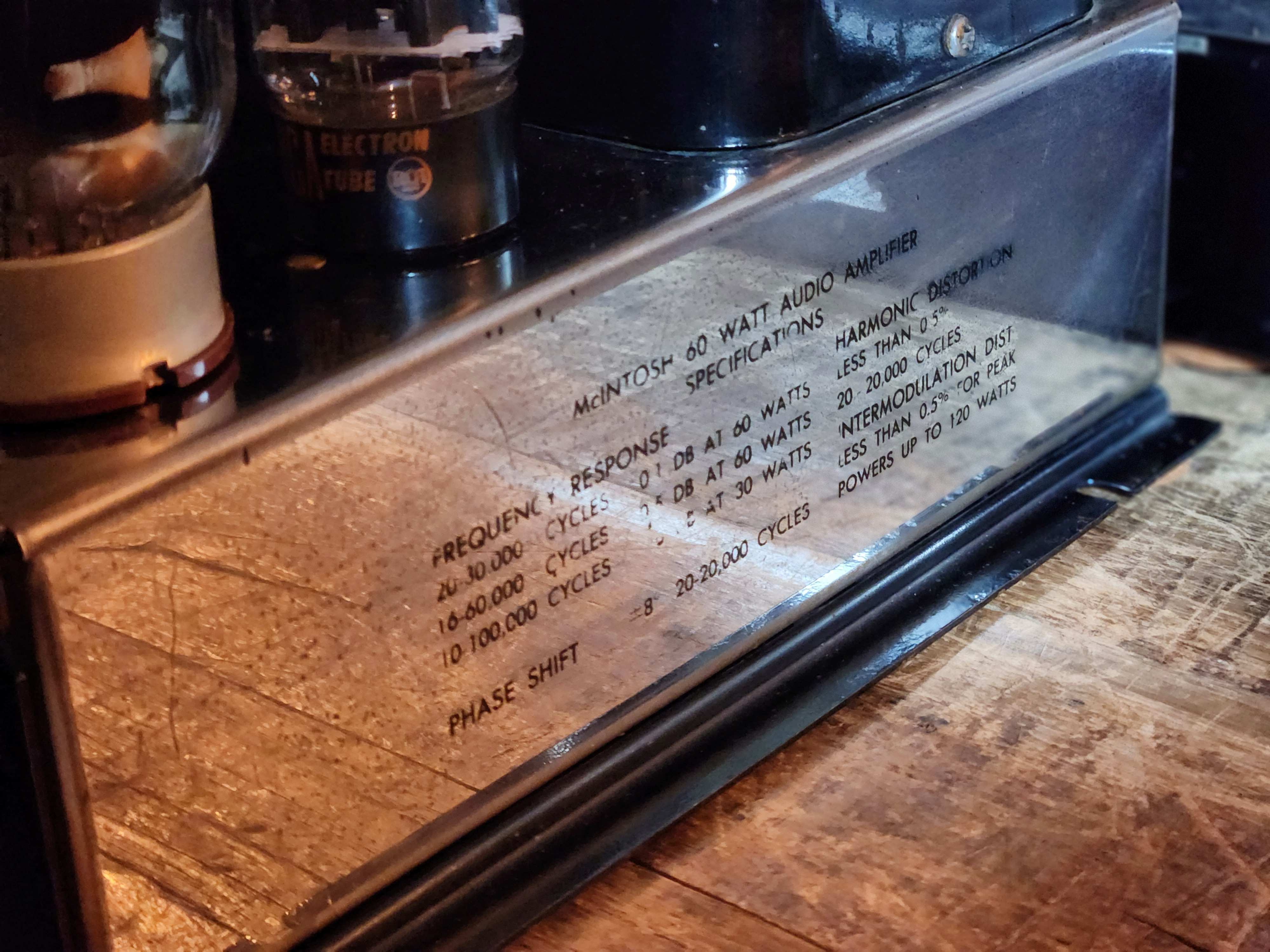 MECHANICAL: Chrome chassis. Octal socket powers McIntosh C-8, C-4, C104, or C-108 preamps. Output octal socket for all impedances. Barrier strip for 4, 8 and 16 ohms as well as 0.5V input. Line voltage tap for 117 or 125V. Audio input. Gain control.